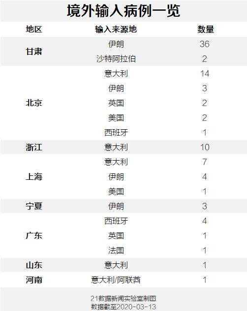 我国疫情防控形势继续积极向好,但随着疫情在其他国家蔓延,中国防控境外输入的压力日渐增大。3月13日,湖北以外30个省份新增7例确诊病例,均为境外输入病例,首次多于本土新增病例。其中北京新增1例,来自美国;上海4例,均来自意大利;甘肃2例,均来自沙特阿拉伯。累计报告境外输入确诊病例95例。
