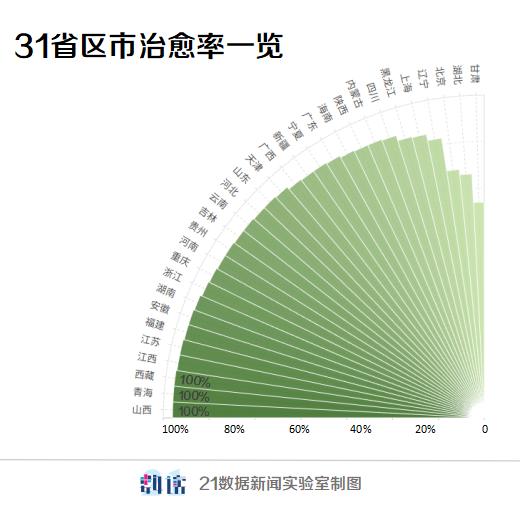 据21数据新闻实验室统计,全国已有超过81%的确诊患者治愈,除了北京、湖北、甘肃,其余省份治愈率均超过90%。