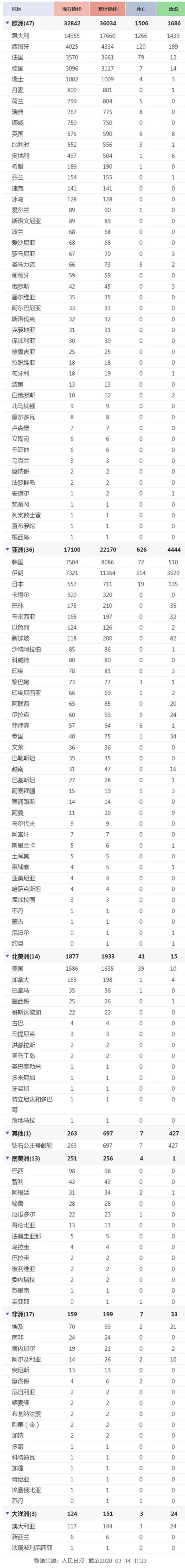 其中,疫情最为严重的意大利累计确诊逼近两万,达17669例,较前一天增加2547例;新增死亡病例250例,累计死亡1266例。