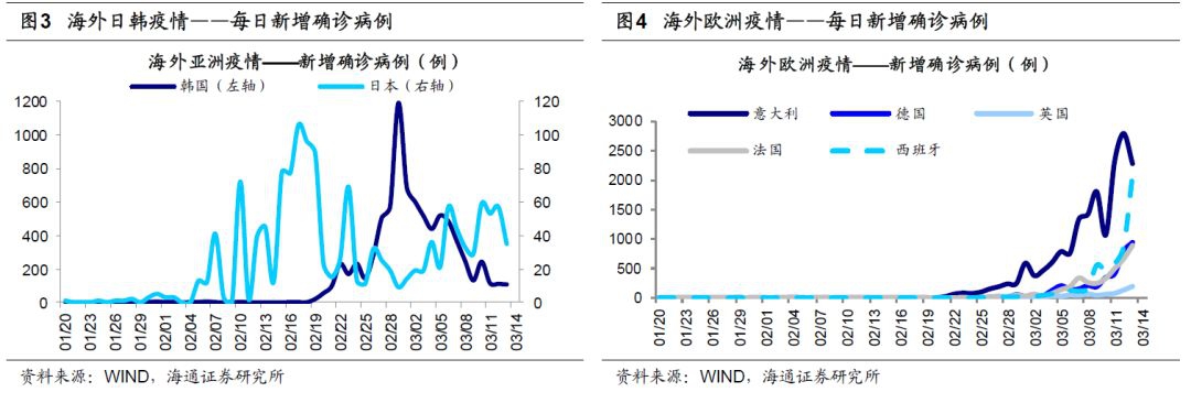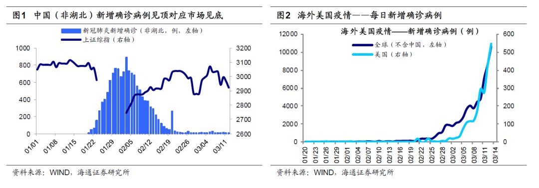 从海外疫情进展来看,3月14日世卫组织发布信息称欧洲已成为新冠肺炎“大流行”的“震中”,其报告的确诊和死亡病例超过中国以外其他国家和地区的总和,每天报告的病例比中国疫情流行高峰时还要多。海外疫情情况跟踪各国应对措施及效果,3月14日美国正式宣布,因新冠肺炎疫情美国进入国家紧急状态,法国政府对全境100人以上聚集活动发出禁令并关闭非必要的公共场所,意大利宣布在全国范围内实施“封城”直至4月3日,西班牙宣布进入紧急状态。参考中国经验,海外新增确诊出现高点时对应外盘股指低点,届时对A股的扰动也将消除。