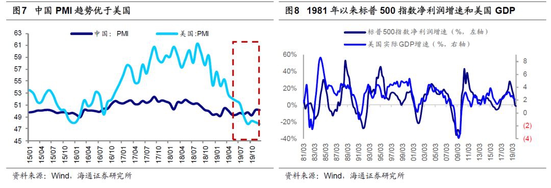 反观美国,参考美股历史盈利周期,1981年以来美股盈利周期平均4.5年,其中上行周期2.5年,下行周期平均2年。这轮标普500净利润同比增速从16Q1的-8.4%回升至18Q3最高的28%,然后持续回落至19Q3的-0.2%,根据历史规律推断,即便没有疫情,美股盈利回落仍要持续到20Q3。