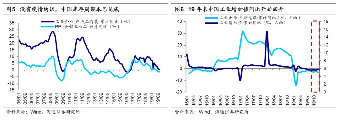 月度基本面数据方面,中国的PMI数据于19年2月份见底,经历了上半年反复磨底之后,19年3、4季度开始回升。工业增加值当月同比从19年10月的4.7%上升到12月的6.9%,工业企业利润同期也在-3%企稳。所以,如果没有新冠肺炎疫情,中国从19年4季度已经进入盈利回升周期。