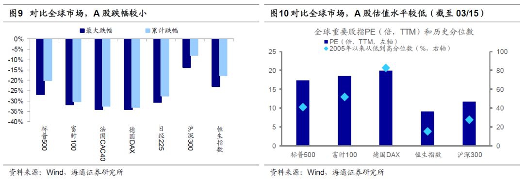 2月下旬以来,海外疫情不断蔓延扩散,全球股票市场遭遇重挫,但A股整体明显强于以美股为代表的外盘。我们统计全球市场各大指数从20年1月高点开始截至目前(03/15)的最大跌幅(累计跌幅),标普500为-27%(-20%)、富时100为-32%(-30%)、德国DAX为-34%(-33%)、日经225为-31%(-28%)、沪深300为-14%(-8%)、恒生指数为-23%(-18%),整体来看A股下跌较少,表现更优。为何A股强于美股为代表的海外市场?本文进行探讨分析。