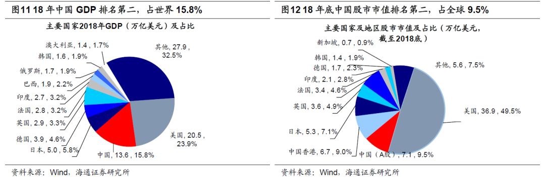 全球市场横向比较,A股优势仍明显。从经济体量上来看,美国和中国目前遥遥领先,其中2018年美国GDP为20.5万亿美元,占全球GDP总量23.9%;中国GDP为13.6万亿美元,占全球GDP总量15.8%;第三名的日本GDP为5.0万亿美元,仅占全球GDP总量5.8%。