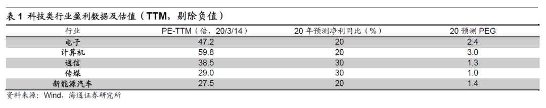 首先,从产业基本面看,5G代表的新一轮科技周期才刚刚开始,类似12-15年的3G/4G,这次基本面的回升预计也要持续2年,从硬件到内容、软件、应用场景不断扩散,即从19年的电子到20年的新能源车产业链、计算机、传媒,详见《本轮科技周期到哪步了?-20200217》),科技类行业盈利数据及估值(TTM,剔除负值)见表1。