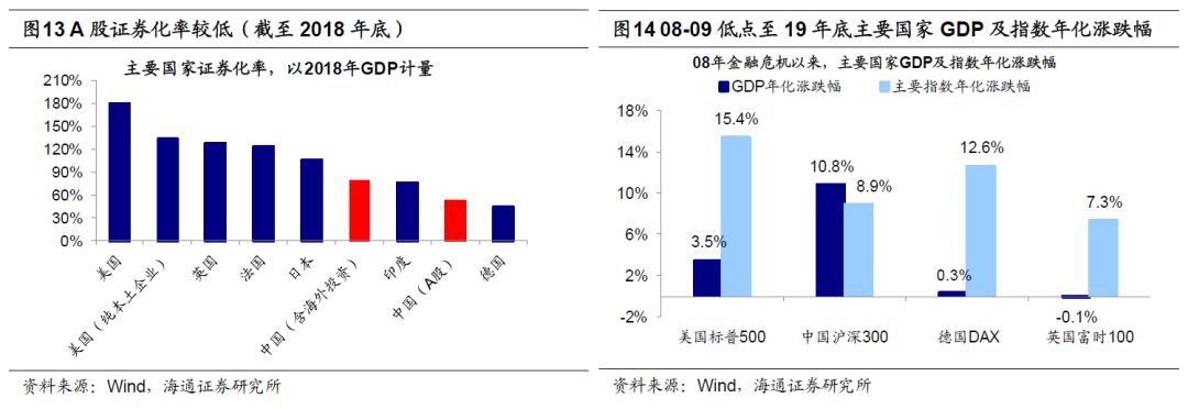 截至18年底,中国的资产证券化率仅为52%(仅考量在A股上市的企业),即使考虑海外中资股,中国的证券化率也只有78%,远低于美国(179%)、英国(127%),也低于法国(123%)、日本(107%)等国。从市盈率历史分位水平来看,沪深300当前市盈率为11.69倍,位于2005年以来的27.2%分位处;而标普500当前市盈率为17.3倍, 2005年以来的历史分位为40.9%;富时100分别为18.6倍,51.6%;德国DAX分别为20.0倍,82.4%。
