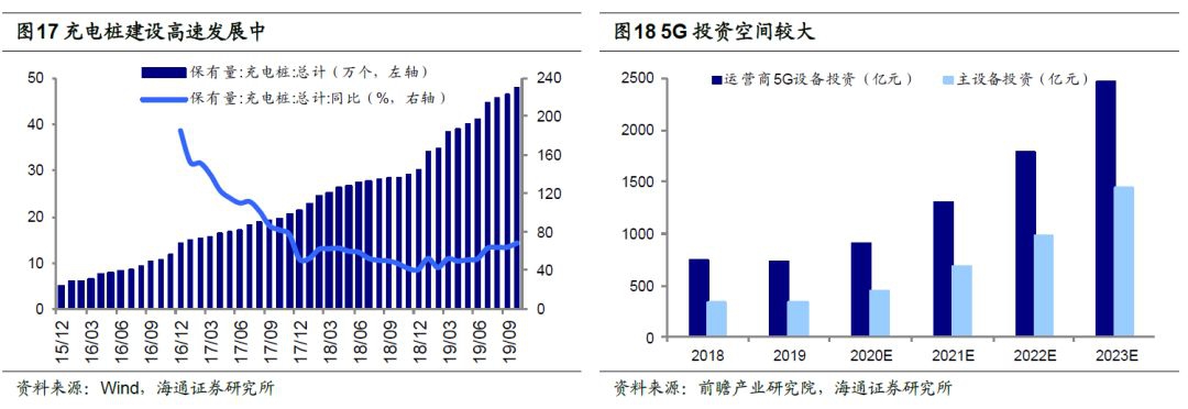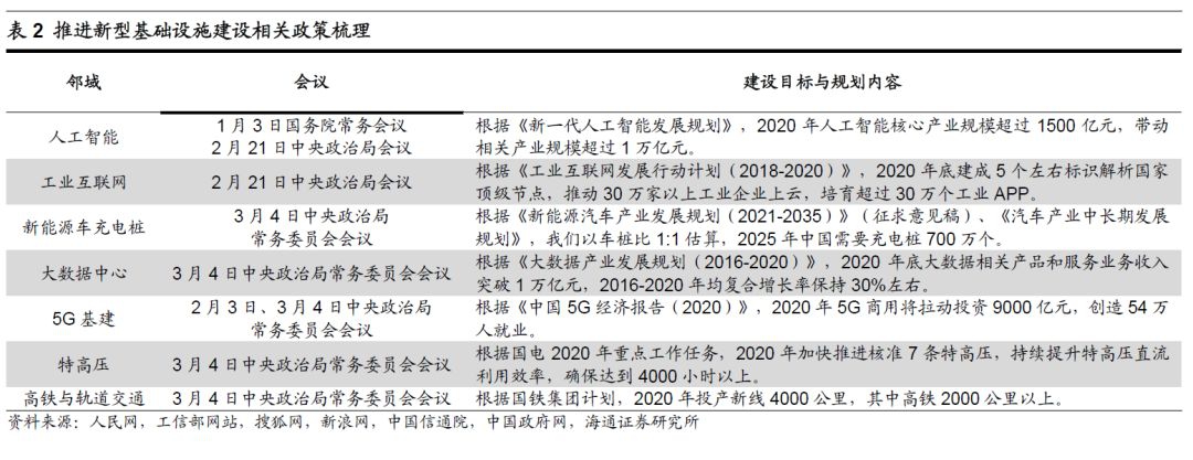 其次,疫情对冲政策中新基建正在发力。18年底的中央经济工作会议首提“加强人工智能、工业互联网、物联网等新型基础设施建设”,新型基础设施建设主要包括:人工智能、新能源汽车充电桩、大数据中心、5G基建、特高压、高铁与轨道交通、工业互联网。新基建投资加码已拉开帷幕,具体情况详见表2,这有助于科技产业基本面的回升。