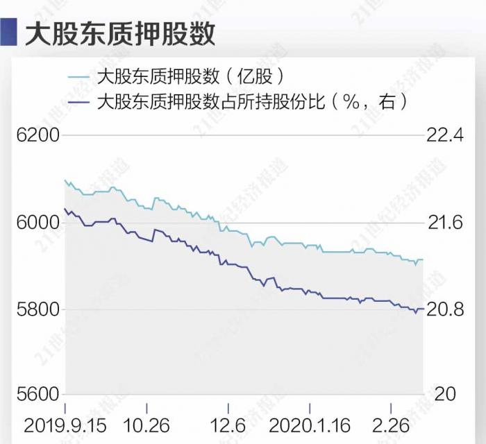 具体来看,截至3月6日,大股东质押股数5913.08亿股,大股东质押股数占总股本比20.8%,半年来持续降低。
