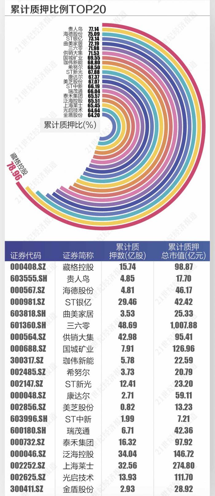 其中前10位分别为藏格控股78.96%、贵人鸟77.14%、海德股份75.09%、ST银亿73.14%、曲美家居72.19%、三六零71.98%、供销大集71.53%、国城矿业69.55%、珈伟新能68.80%、希努尔68.50%。