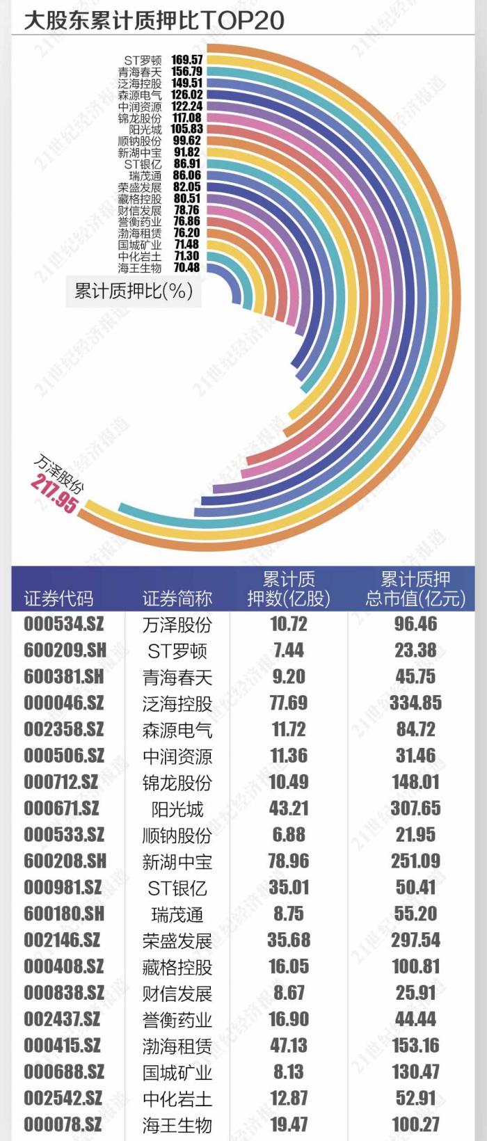 21世纪经济报道南方责任投资计划研究团队统计发现,目前A股上市公司中有67家上市公司大股东累计质押比例超过50%,其中万泽股份、ST罗顿、青海春天、泛海控股、森源电气、中润资源、锦龙股份、阳光城8家大股东累计质押比例更是超过100%。