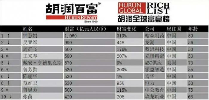 另外,前十名中9位来自中国。其中翰森制药59岁的钟慧娟,财富上涨至去年4倍多,以1060亿财富成为全球最成功女企业家;去年的全球白手起家女首富,龙湖集团56岁的吴亚军财富增长44%,以990亿财富位列第二;蓝思科技50岁的周群飞以660亿财富位列第三。
