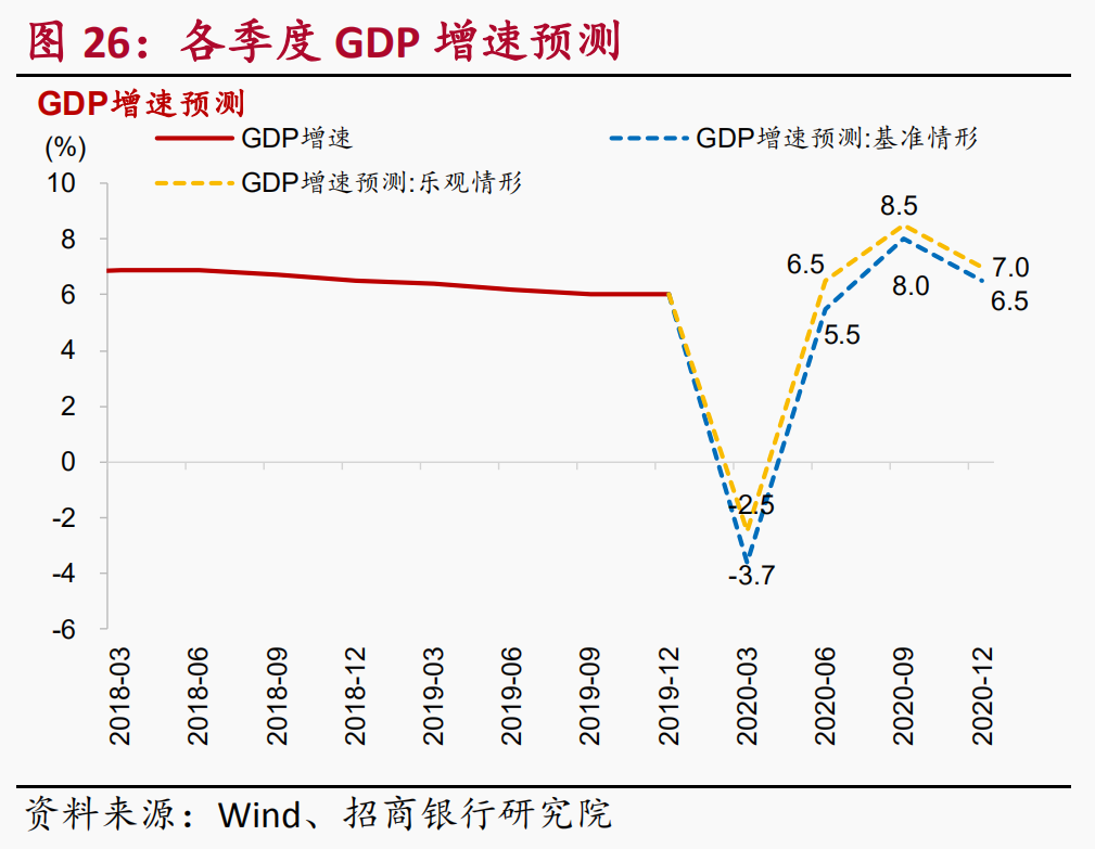 在基准情形下,预计二季度经济稳步回升,但受制于疫情在海外的蔓延,增速难以回复到趋势增长水平;三季度,随着刺激政策的加码,可能出现报复性增长,明显高于潜在增长水平;进入四季度,冬季来临病毒可能再次活跃,但疫情基本受控,经济增速回到趋势位置。
