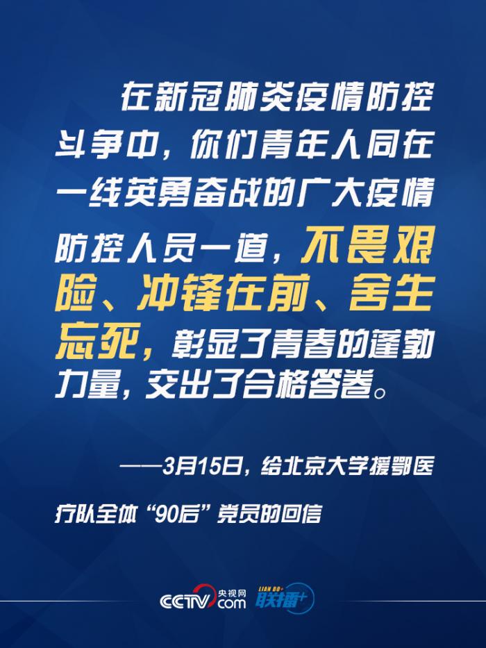 “广大青年用行动证明,新时代的中国青年是好样的,是堪当大任的!”在3月15日给北京大学援鄂医疗队全体“90后”党员的回信中,习近平这样点赞新时代中国青年。