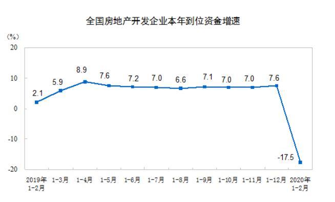 融资方面,前两月房地产开发企业到位资金20210亿元,同比下降17.5%。受销售下滑影响,定金及预收款的降幅达到23.9%。