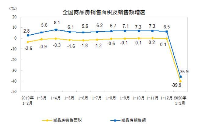 3月16日,国家统计局发布数据显示,2020年1—2月份,全国商品房销售面积8475万平方米,同比下降39.9%。其中,住宅销售面积下降39.2%。商品房销售额8203亿元,同比下降35.9%。其中,住宅销售额下降34.7%。