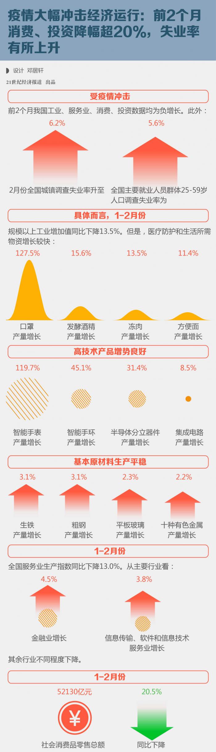 受疫情冲击,前2个月我国工业、服务业、消费、投资数据均为负增长。此外,2月份全国城镇调查失业率升至6.2%,全国主要就业人员群体25-59岁人口调查失业率为5.6%。