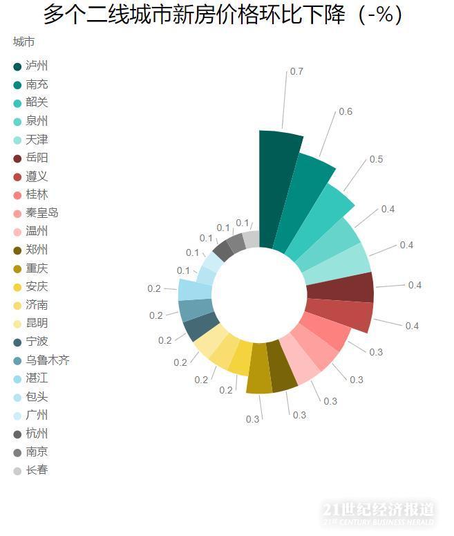 不过,21世纪经济报道记者注意到,与成都不同,受疫情影响,还有大量的二线城市,房价出现回落。其中,包括长春、南京、杭州、宁波、郑州、重庆、天津等多个强二线城市,均出现了不同程度的回落。