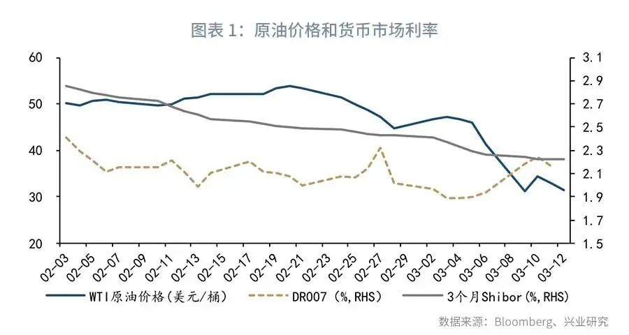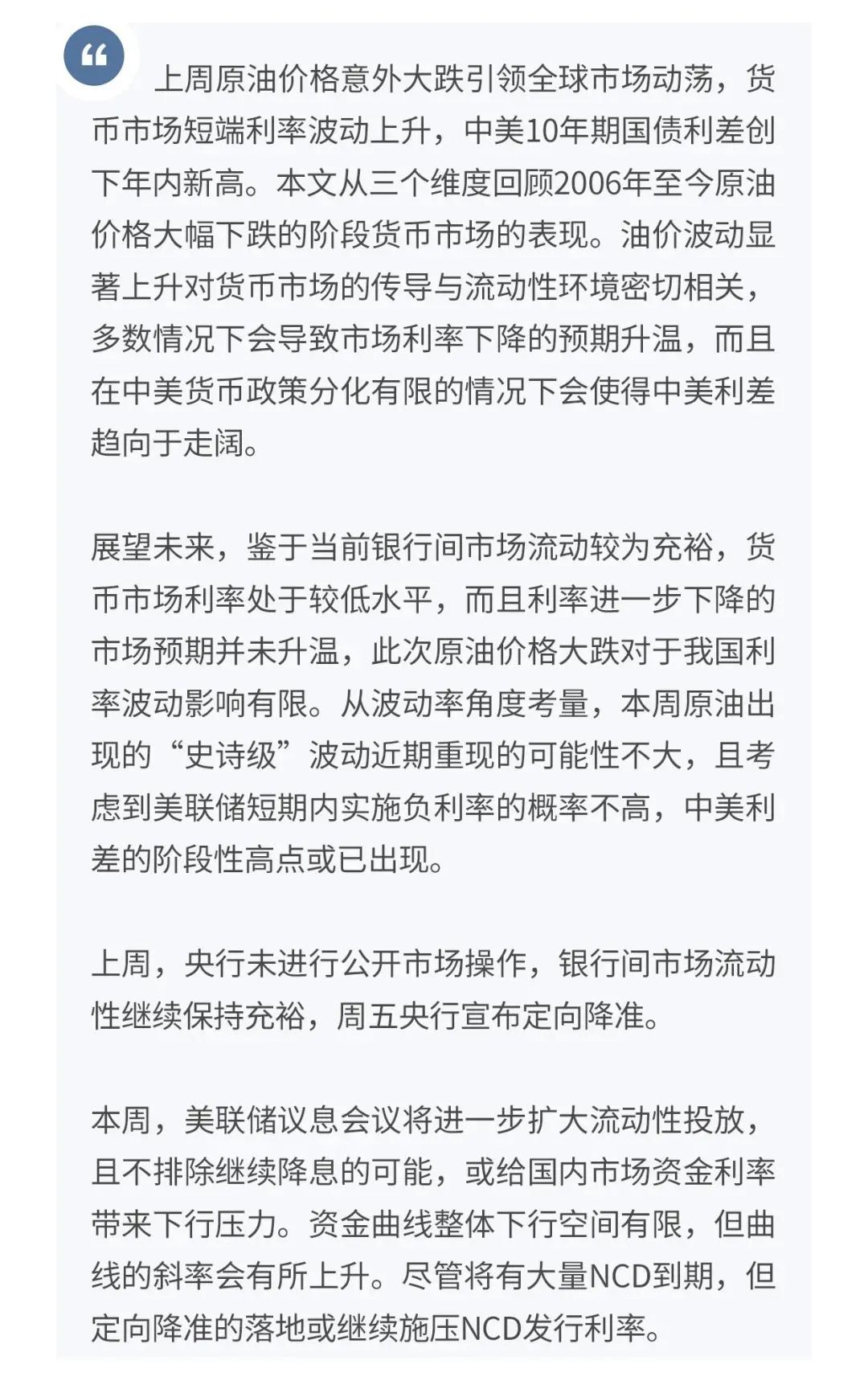 本周,在疫情继续扩大蔓延的背景下,OPEC和俄罗斯关于稳定油价的谈判破裂,国际原油价格突然出现大幅闪崩,国际金融市场动荡。在此影响下,我国货币市场短端利率在周初略有反弹后随即出现回落,长端利率也继续缓慢下跌,导致资金利率曲线平坦化。