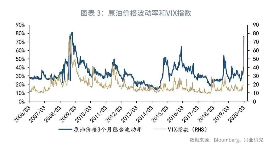 如何对原油市场的“暴跌”程度进行界定呢?一种方法是单纯从原油价格的跌幅来看,不过这种方法的不足之处在于市场行情会有阶段性的特点,平稳时期小幅下跌的影响可能不会弱于动荡时期较大幅度的调整。因此,在本文中,我们采用价格调整幅度和期权隐含波动率两个角度来评估原油市场的变化。因为原油价格波动率和市场恐慌指数VIX密切相关,它某种程度上反映了原油价格变化的冲击大小(见图表3)。由于数据的可得性以及本报告主要研究原油冲击对我国货币市场的影响,因此选取的时间集中在2006年1月至今。