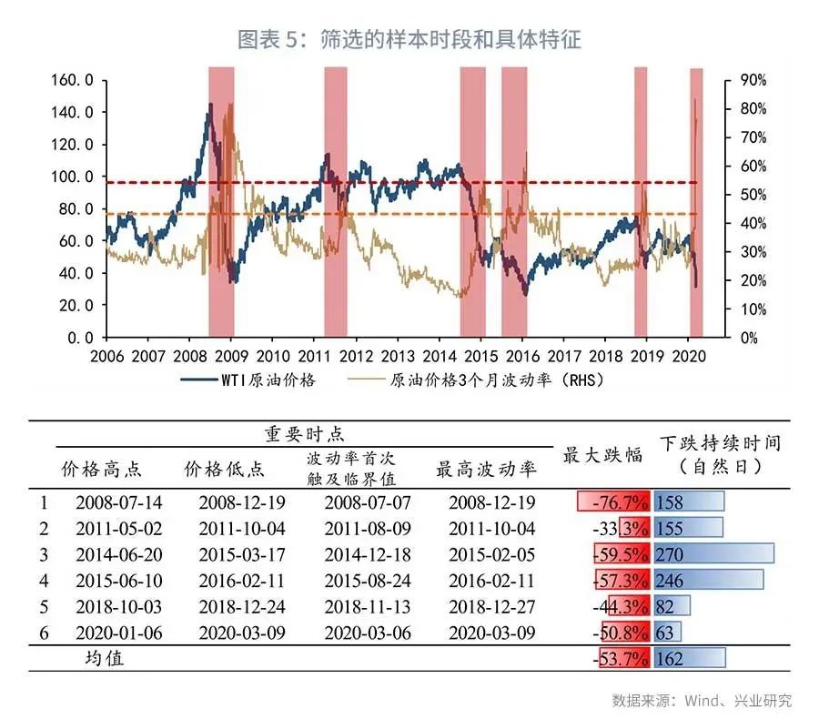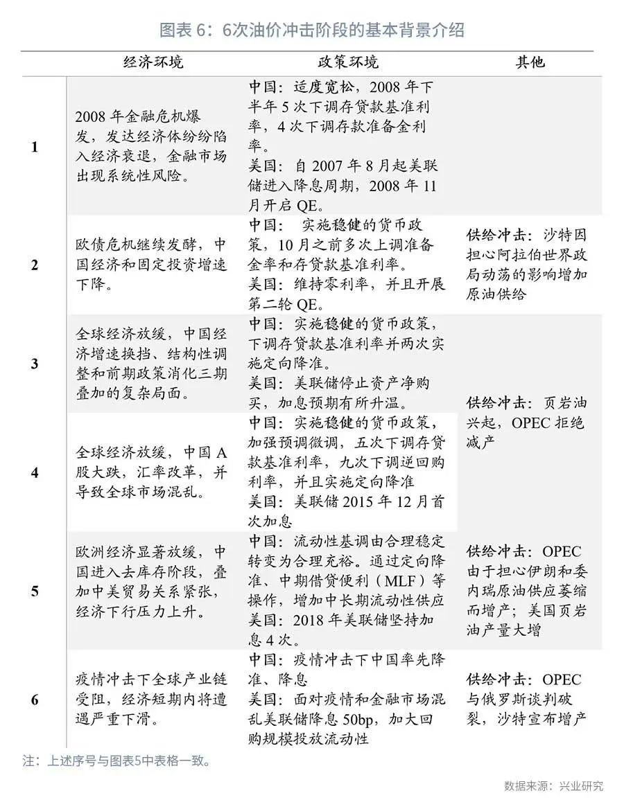 原油价格和波动率呈现出风险资产常见的“缓涨急跌”的特征。当波动率处于较低水平时,原油价格往往上涨或者处于震荡,为了剔除正常的情况,我们主要研究出现波动率超过“均值+1倍标准差”且原油价格处于下跌状态的阶段。通过这个标准我们筛选出6个阶段,如图表5。6个阶段虽然情况各异,但导致油价暴跌的原因大致有三个:一是经济下行带来需求不足,这是6次下跌的共同宏观背景;二是金融市场系统性危机推波助澜,比如2008年就是如此;三是过度供给,2008年金融危机过后的很多次下跌均与此有千丝万缕的关系,这涉及OPEC国家、俄罗斯和美国的能源博弈。