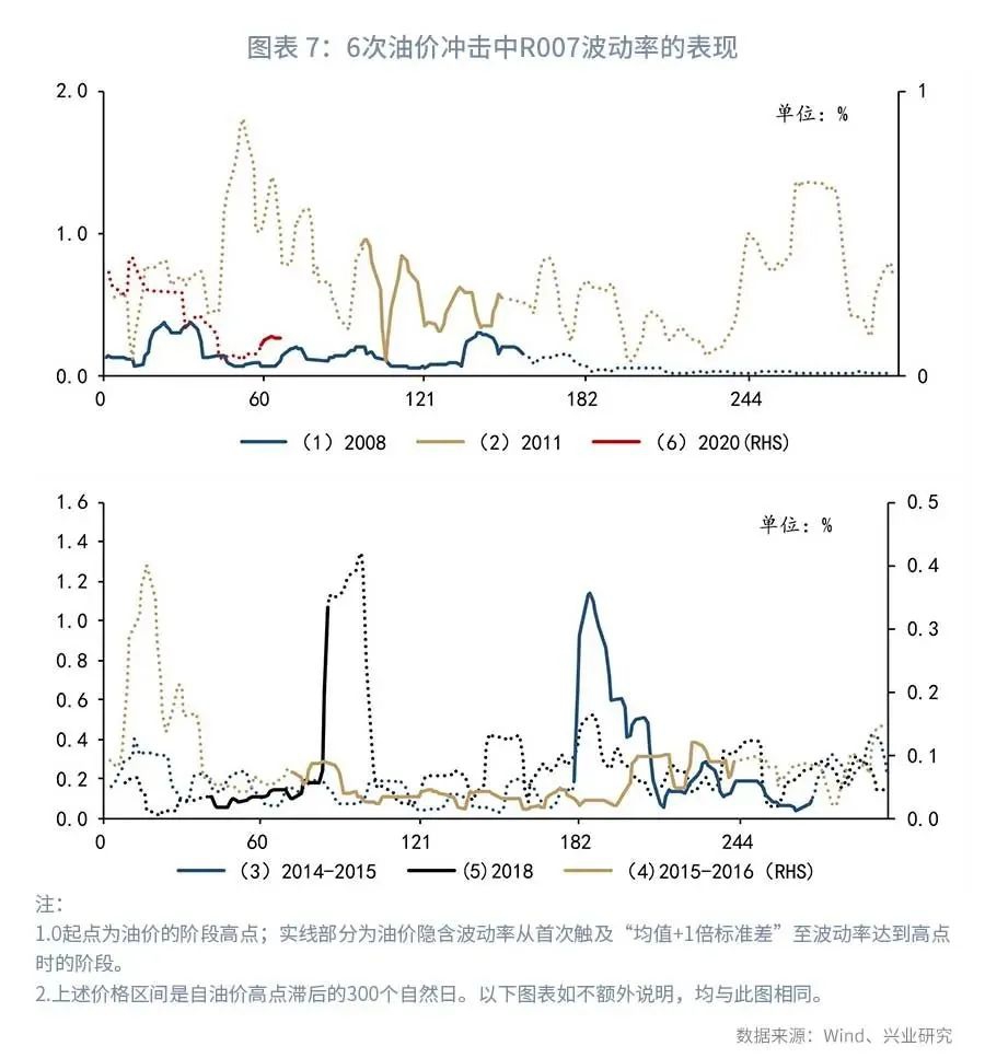 从短期市场情绪的影响来看,油价波动率“异常”上升对货币市场的传导在不同情况下表现不同。需要关注当时的货币政策和流动性市场的季节性特征。当货币政策偏向宽松时,叠加经济压力带来的信贷需求疲软往往会造成银行间市场流动性较为充裕,使得货币市场利率波动率上升较为有限(对应的利率水平上涨也较为有限),比如2008年下半年(即图表7中“(1)2008”),2015年第三季度至2016年初(“(4)2015-2016)以及当前(“(6)2020”)。不过由于危机后对于银行资产和流动性的监管趋严,当油价波动恰逢资金跨年,货币市场会出现十分明显的短期波动(利率水平上升),比如2014年12月(“(3)2014-2015”)和2018年12月(“(5)2018”),具体见图表7的实线部分,它们表示的是油价波动率超过我们设置的筛选标准后、到达峰值的阶段中R007波动率的变化。