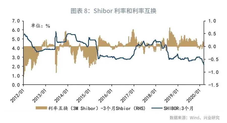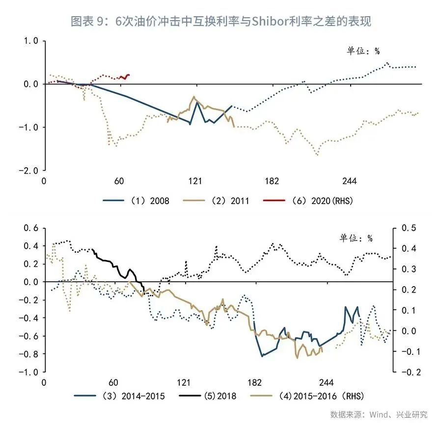 从市场预期来看,我们使用浮动端为3个月Shibor利率的利率互换与Shibor利率之差来衡量市场对于货币市场利率下跌的预期程度,尤其当这一利差转负时,往往其后对应着Shibor利率的下跌(见图表8)。前5次油价下跌冲击下货币市场都会进一步预期利率未来将下降,不过本次货币市场的反应有些特殊,这可能与当前货币市场流动性较为充裕、利率水平已偏低有关。