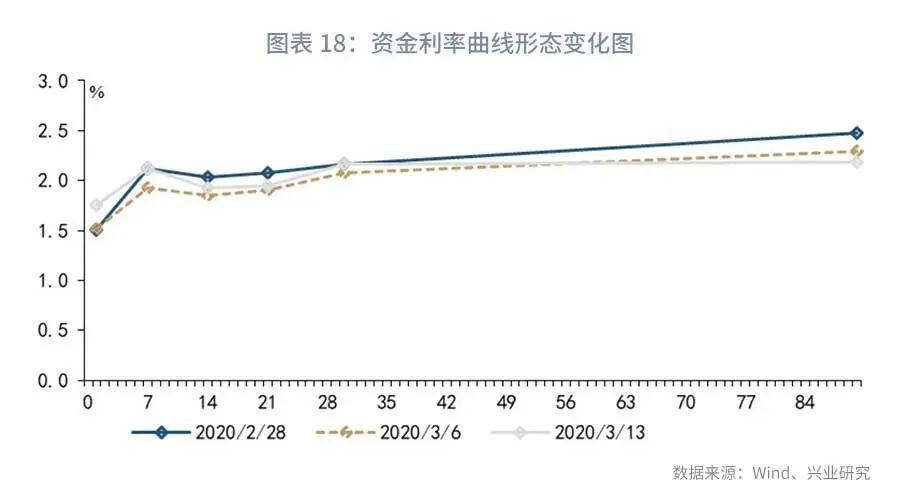 第二,从货币市场利率曲线形态来看(图表18),利率曲线较上一周整体上行,仅3M期限利率微跌外其余期限利率均尚在,曲线于7D、30D处微凸,陡峭幅度增加。