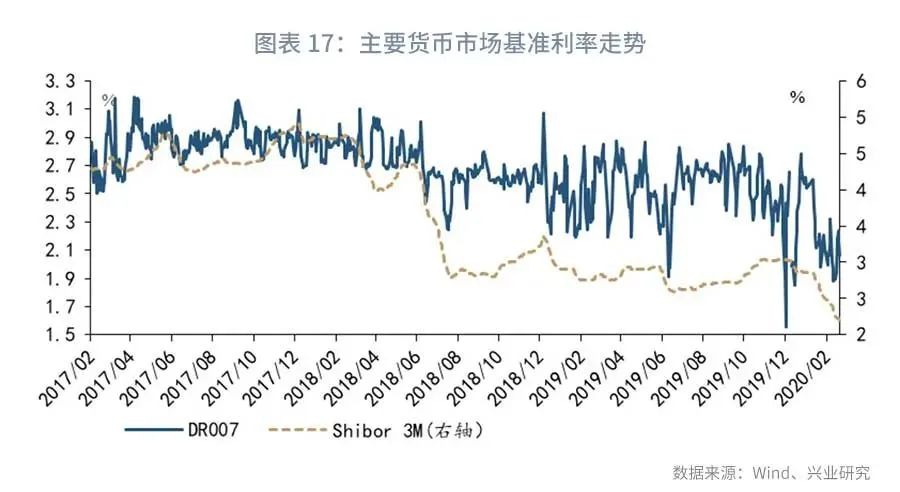 第一,从绝对水平来看(图表17),上周资金流动性处于充裕水平,DR001上周上行4bp收于1.41%,周内均值较上周上涨24bp。DR007上周收于2.06%,较前一周上涨17bp。Shibor 3M收于2.20%,较上一周末下跌6bp。