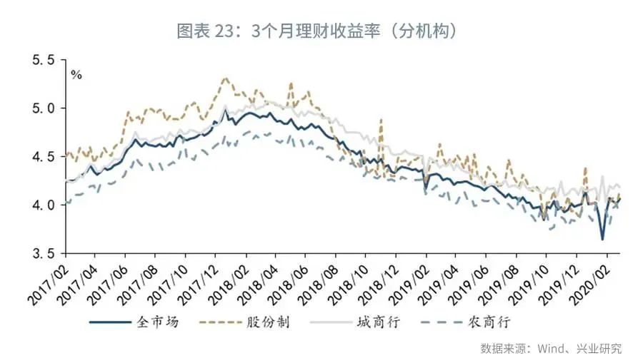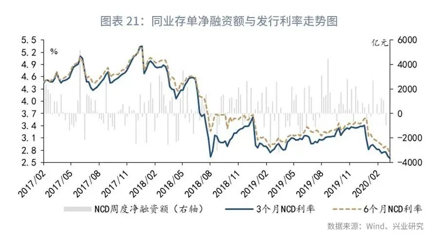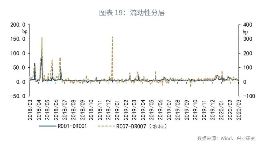第三,流动性分层的角度(图表19)看,上周流动性分层现象整体较前一周减少,R007与DR007的平均利差为8.78bp,较上周下降16.0bp。上周所有交易日R007与DR007未出现倒挂现象。