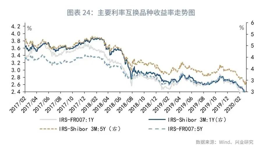 第四,货币市场投资工具方面,所有主要投资工具除理财收益率外均下行。同业存单品种方面(图表21),上周发行量为4162.70亿元,净融资量-978.48亿元。3个月NCD发行利率收于2.53%,较前一周下跌20bp;6个月NCD发行利率收于2.72%,较前一周下跌15bp。票据方面(图表25),3个月国股银票转贴利率收于2.41%,较前一周下跌6bp。理财方面(图表23),全市场3个月理财产品收益率上涨4.2bp至4.06%;利率互换方面(图表24),上周最活跃的两大品种:1Y FR007收报于2.27%,较上一周上行7.5bp;1Y SHIBOR3M收报于2.46%,较前一周上行5.1bp。