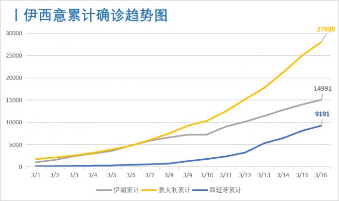 欧洲地区疫情最为严重,西班牙、意大利两国累计确诊逼近4万例,达37171例。据西班牙卫生部16日公布的数据,西班牙新增确诊病例1438例,累计确诊病例即将破万,达9191例,其中309人死亡。截止当地时间16日18时,意大利新增确诊病例3233例,累计确诊27980例;新增死亡病例349例,累计死亡2158例。