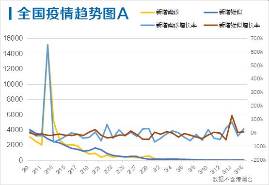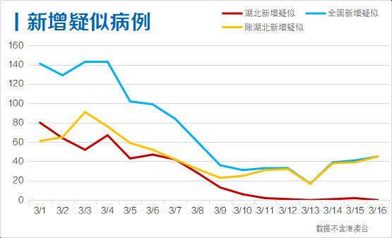 截至3月16日24时,全国现有疑似病128例,新增疑似病例45例,连续11天保持在两位数。湖北新增疑似再次实现0增长,现有疑似病例首次降至个位数,仅为3例(武汉1例),持续加速下探。