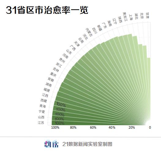 据21数据新闻实验室统计,全国已有84.91%的确诊患者治愈出院;湖北治愈率持续抬升,达到82.58%;全国除湖北治愈率升至97.02%,持续增长。江苏、山西、宁夏、青海、西藏治愈率达到100%,无死亡病例。