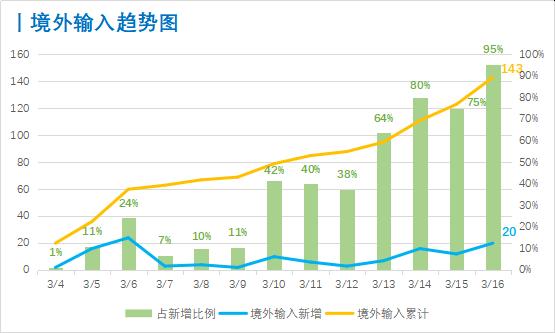 广西、陕西在零新增超20天后首次出现境外输入病例。截至3月16日24时,累计报告境外输入确诊病例已达143例。其中,北京累计报告境外输入已达40例,为应对境外疫情输入风险,北京市小汤山医院启用,主要用于境外来(返)京人员中需筛查人员、疑似病例及轻型、普通型确诊患者治疗。