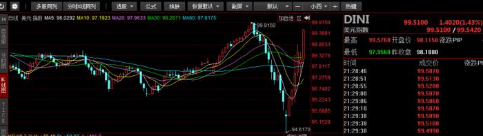 3月17日晚,美元指数大涨超过1.2%,目前已经涨至99.337,盘中摸高99.576,有望冲击100。3月10日以来,美元指数就出现明显的强势,目前涨幅已经达到4.2%。