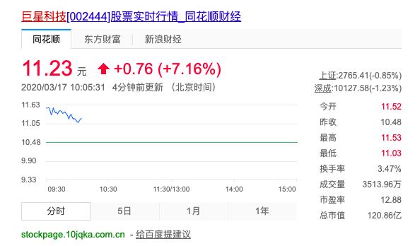 3月17日,巨星科技(002444.SZ)开盘后一度封上涨停板,报11.53元,截至发稿,涨幅达7.16%。