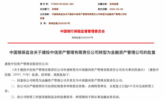 3月16日,中国银保监会官网发布了《关于建投中信资产管理有限责任公司转型为金融资产管理公司的批复》。