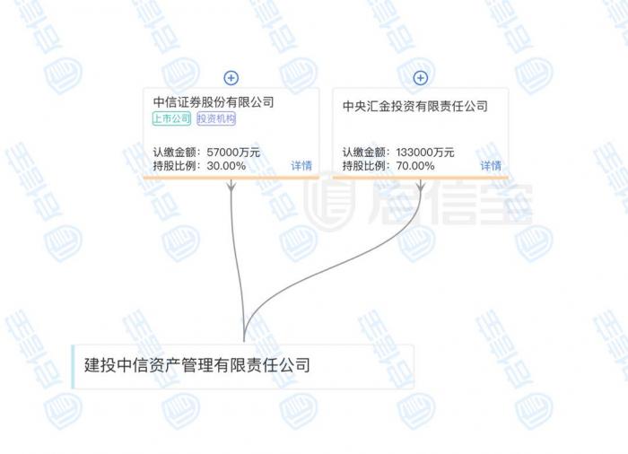 而启信宝数据显示,建投中信目前的股权结构中,其股东为中央汇金投资和中信证券,分别持股70%、30%。