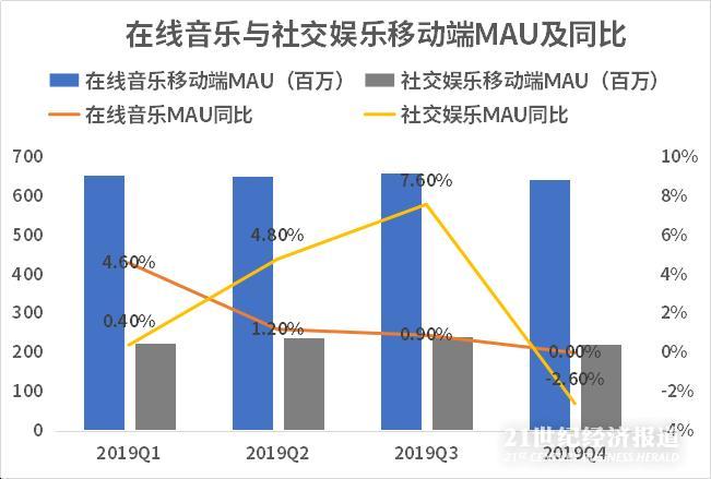 因此,在线音乐的MAU(月活跃人数)是腾讯音乐负责“蓄水”的流量池子,2019年四季报的数据显示,腾讯音乐去年四季度的在线音乐业务月活为6.44亿,和2018年同期持平,但是跟去年三季度的6.61亿比,环比下滑了2.6%。