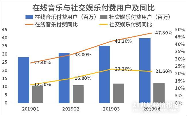 从收入结构上看,社交娱乐依然是腾讯音乐的主要业务支柱,2019年四季报显示,腾讯音乐的社交娱乐业务收入51.5亿元人民币,占到总收入的70.6%,在线音乐业务收入21.4亿元,只占29.4%。