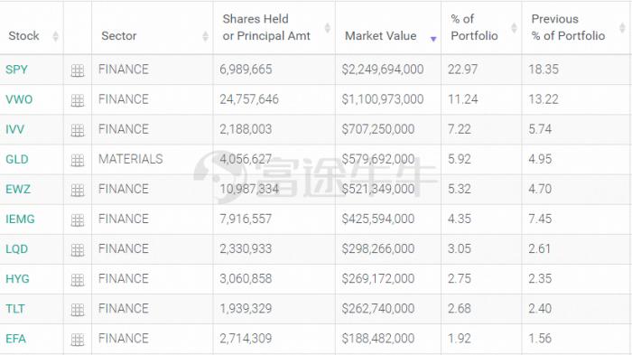 根据2月13日提交的美股持仓报告显示,桥水基金前十大重仓标的均为ETF,第一大重仓标的为标普500指数ETF-SPDR,截至2019年12月31日,持仓市值高达22.5亿美元,而今年该标的大跌21%;第二大持仓标的为新兴市场ETF- VWO,尽管在四季度减持33%,但VWO仍占11.24%的持仓,该标的今年大跌24%;此外,第三大持仓标的依旧是追踪标普500的ETF—IVV,该持仓标的今年大跌21%。