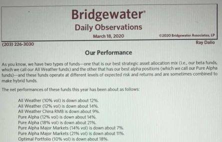 近日据彭博报道,受冠状病毒引发的市场动荡影响,达里奥桥水基金的纯Alpha宏观策略基金Ⅱ今年迄今跌幅约20%。桥水基金管理资金1600亿美元,约一半适用于该宏观策略基金。