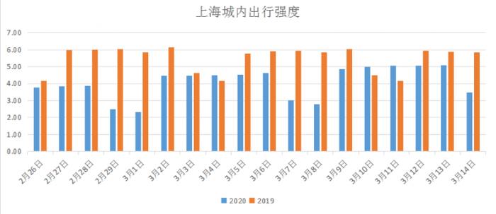 数据显示,3月4日,上海城内出行强度以4.49超去年同期4.16;3月10日,又以4.99超去年同期4.48;3月11日,再以5.05超去年同期4.18。