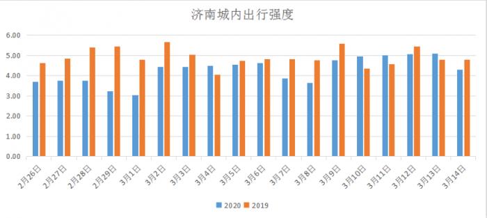 3月4日,济南以4.49 超去年同期4.01;3月10日,以4.94超去年同期4.34;3月11日,又以5.01超去年同期4.57;3月20日,再以5.09超去年同期4.78。济南市出台有《济南交警保障复工复产服务经济社会发展十条举措》,包括货运车辆解除限行等;