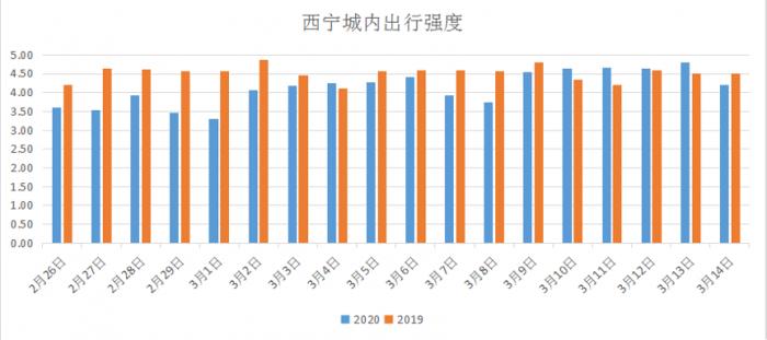 3月4日,上海、南京、厦门、济南、西宁成为第一批2020年城内出行强度高于2019年同期的城市。自2月10日复工以来,这5个城市城内出行强度以周为单位,环比上涨趋势明显。