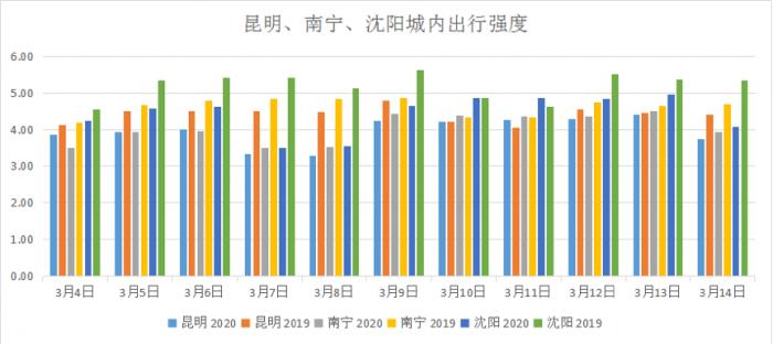 继3月4日首批5个监测城市出行强度超过去年水平后,3月10日,深圳、杭州、南宁、沈阳、昆明、宁波2020年城内出行强度高于2019年同期。