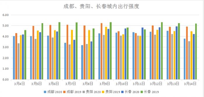 3月11日,广州城内出行强度3.52超过去年同期3.47,福州以3.99超去年同期3.73;青岛以4.93超去年同期4.60,成都以4.40超去年同期4.31;长春以4.82超去年同期4.65,贵阳以4.07超过去年4.06。