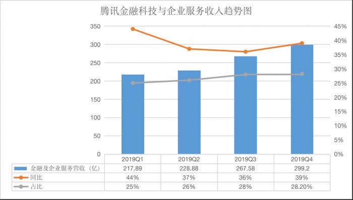 金融科技及企业服务收入为299.20亿元,同比增长39%,占总营收比重28.2%,已接近游戏业务占比。