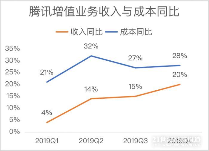 从上图可以看到,去年四个季度,腾讯增值业务的收入同比增速都是低于成本同比增速的,但是喇叭口逐渐收窄,收窄挤出的就是更多的利润,这意味着增值业务的利润逐季好转。