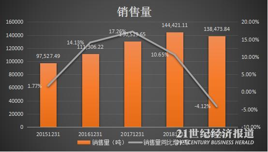 从销量上看,涪陵榨菜主营产品的销量增速自2017年起出现下滑,2018年销量增速由17.26%下降至10.65%,而2019年更是出现了负增长的情况,全年销售榨菜13.8万吨,相较2018年同比下降4.12%。